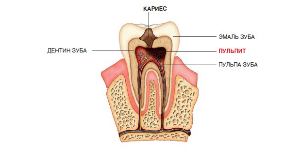 Чаще всего пульпит развивается при долго существующем кариесе зуба.